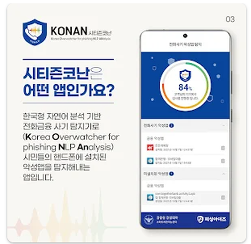 시티즌코난은 누구나 쉽게 사용할 수 있는 보이스피싱 예방앱으로, 사용자의 통화 내용을 실시간으로 분석해 의심스러운 키워드를 감지하고, 위험이 감지될 경우 경고음을 통해 즉각적인 주의를 환기합니다.