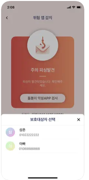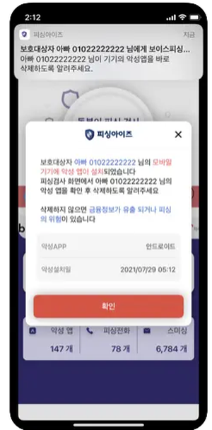 - 악성 앱 탐지 알림 보호 대상자의 스마트폰에 보이스피싱 또는 해킹 가능성이 있는 악성 앱이 설치되면, 즉시 알림을 제공합니다.
