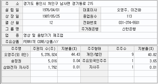 삼화전자는 1976년 설립되어 전자부품 제조업을 영위하고 있으며, 주요 사업으로는 페라이트 코어 및 비드를 생산 판매하고 있습니다. 국내 유일의 종합 페라이트 코어 전문회사이며, 세계시장 점유율 1위입니다. 최근 5년간 매출액 CAGR 14% 성장하였으며, 영업이익률 또한 10% 이상 유지하며 안정적인 수익성을 보이고 있습니다.